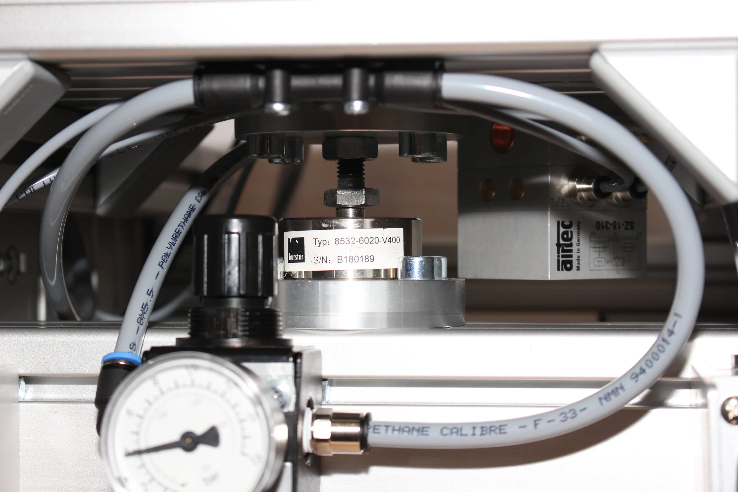 At the end of the linear conveyor there is a separator (picture on the right), which is mounted to match the discharge height of the linear conveyor. From the separator the blind rivet nuts are blown down through a hose into the transfer station.