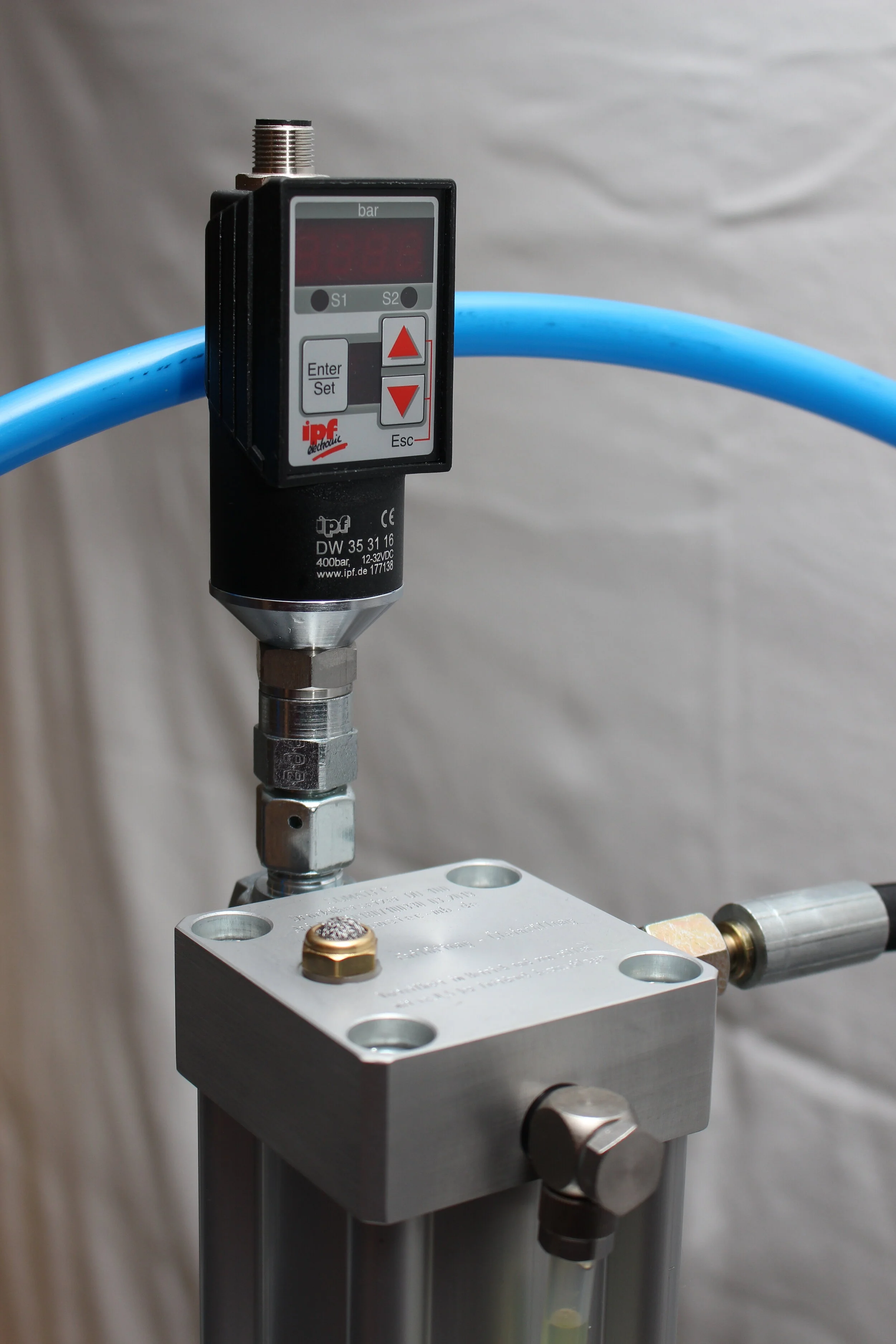 The choice of sensors for measuring the force (Y) of the setting tool depends on the drive of the force generation and whether the tool is pulling or pushing. In the case of a pulling tool in conjunction with a pressure intensifier, a Type 8227 pressure transmitter with measuring ranges of 100 or 500 bar is used.